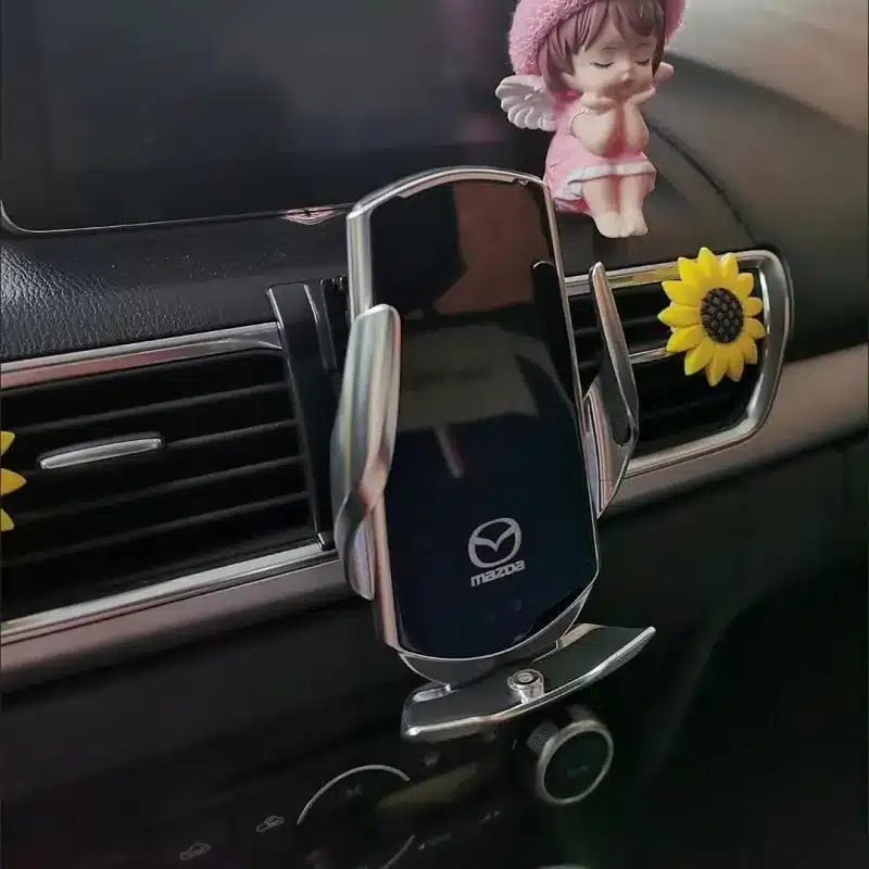 2. Infrared Sensing: Our Mazda wireless charger car holder adopts the latest infrared sensing technology. When the phone is close to the holder, the holder will automatically expand its arms and then retract to clamp the phone. Touch the fingerprint sensing area on the back of the phone holder to remove the phone.